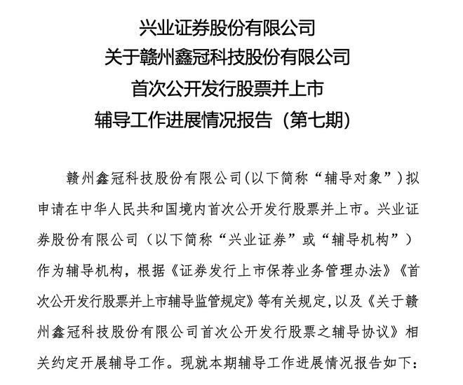 近日,赣州鑫冠科技股份有限公司 (以下简称“鑫冠科技”)披露IPO辅导工作进展报告(第七期),辅导机构为兴业证券股份...