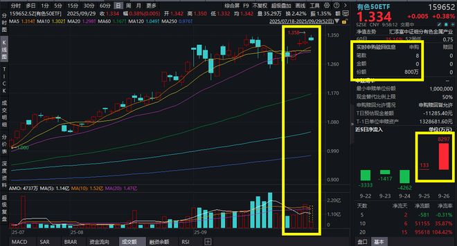 9月29日,有色板块高开回落,截至9:58,有色50ETF(159652)微涨0.38%,一度涨超1.5%,资金持续...